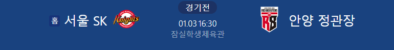 1월1일 맞대결을 펼친 두 팀의 리턴매치가 된다. 서울SK는 직전 맞대결에서 패했지만 홈에서는 경기 운영과 수비 집중력이 상대적으로 안정적인 팀이다. 안영준과 자밀 워니 중심의 공격 구조가 명확하고, 직전 경기에서 낮았던 야투와 3점 성공률은 반등 여지가 크다. 또한, 연속 홈경기 일정 속에서 로테이션 조정과 수비 압박 강도를 끌어올릴 가능성이 높다. 반면 안양 정관장은 최근 흐름과 원정 성적이 좋지만, 다음날 홈에서 부산KCC를 만나는 일정을 위해서 힘을 분산해야 하는 일정이 부담이며 리턴매치 부담 속에서 같은 경기력을 재현하기는 쉽지 않다.