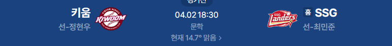 키움은 정현우를 내세워 시즌 첫 연승을 노린다. 지난 시즌 데뷔해서 3승 7패 5.86의 아쉬운 성적을 남긴 정현우는 역시 고졸 1년차의 한계를 여실히 느낀바 있다. 지난 시즌 SSG 상대로 원정에서 4.1이닝 5실점으로 좋지 않았는데 구장을 심하게 타는 타입이라는 점이 걸린다. 전날 경기에서 타케다와 이기순을 공략하면서 11점을 터트린 키움의 타선은 무려 6개의 2루타를 터트리는등 2루타로 상대를 무너뜨렸다고 해도 과언이 아니다. 개막 이후 화력 자체는 나쁘지 않긴 하지만 기복이 심한 문제를 고쳐야 할듯. 4이닝동안 2실점을 허용한 불펜은 매 경기가 벌떼 야구인듯 하다.